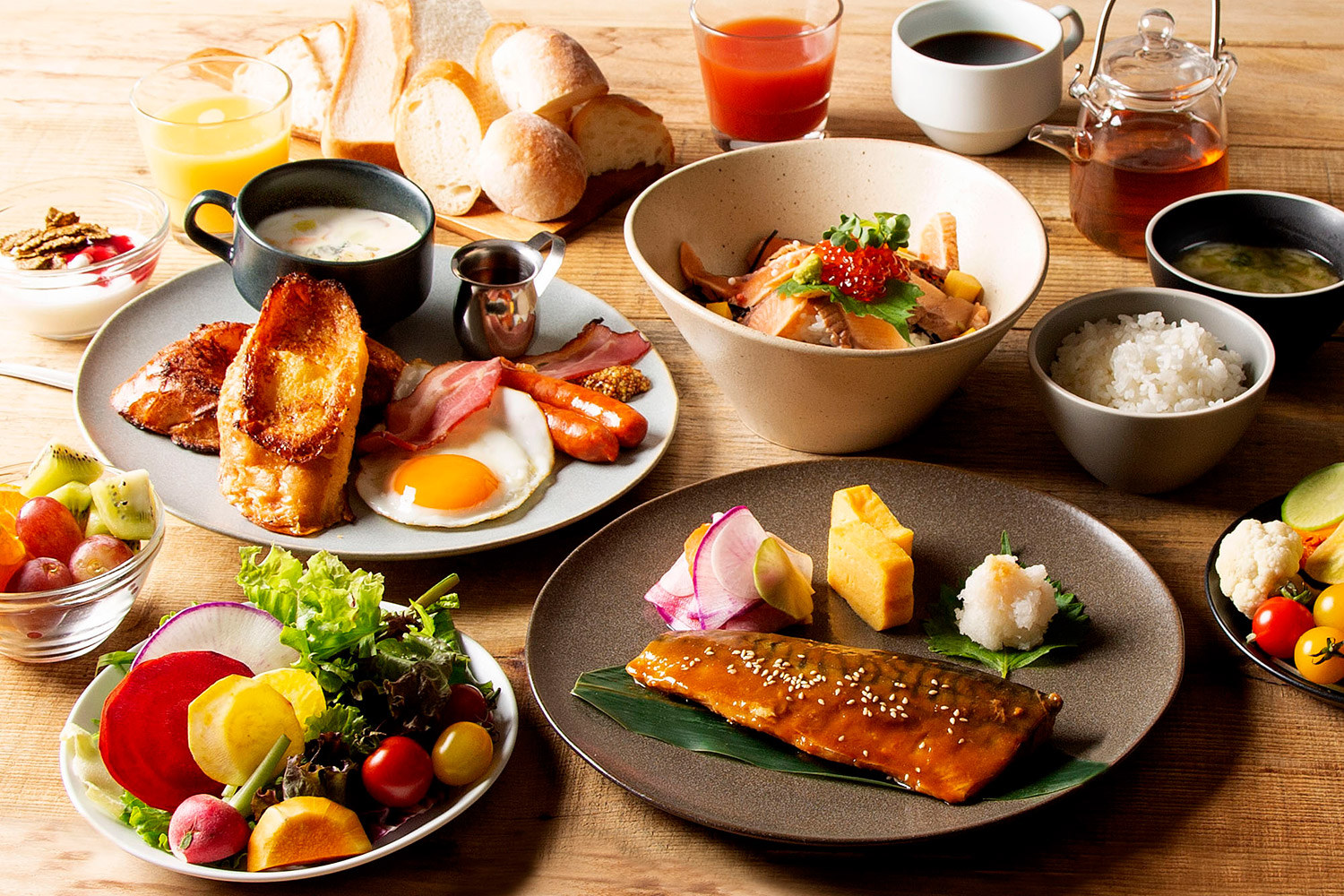 일식·양식·덮밥 중에서 선택할 수 있는 플레이트와 신선한 미우라 채소 샐러드, 음료의 세미 뷔페 조식을 제공.