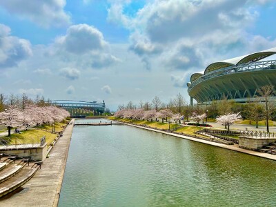 公園の中央にはカナールという運河があり、運河に掛かる橋から桜並木と一緒にビッグスワンスタジアムやECOスタジアムも一望できます。